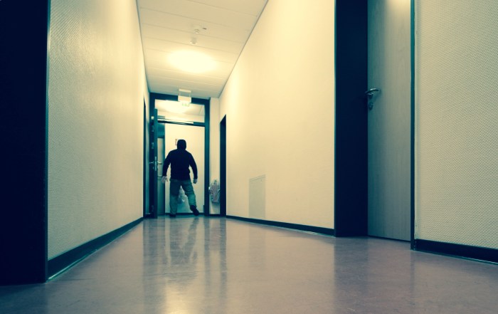 Doch wie das in verlassenen Häuser ist, machen alle Wände hier Geräusche. Wenn sich die Bewegungsmelder ein und ausschalten, knackt es unterm Dach. Überhaupt Bewegungsmelder: haben sich schon irgendwann einmal Geister und Irrsinnige im Blutrausch von Bewegungsmeldern beeindrucken lassen? Wahrscheinlich haben die Irren die Bewegungsmelder erfunden, um die Normalen in Sicherheit zu wiegen.