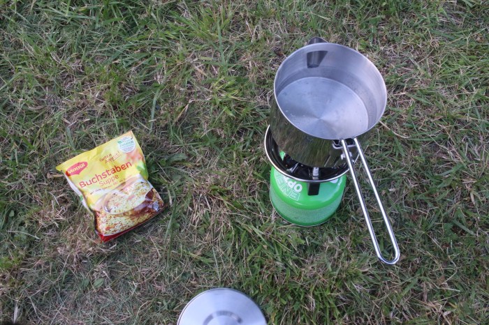 Wenn nämlich die ganze Wiese mit Rasenschnitt voll liegt, ist es eine Frage der Zeit, bis man das Zeug im Zelt, in den Socken, im Schlafsack, in den Fahrradtaschen und sonst wo hat. Mit Grauen denke ich daran, morgen auf der feuchten Wiese das Zelt einzuwickeln. Ich werde sicher auf der morgigen Etappe zwei Kilo Rasenschnitt in den Taschen transportieren. Deshalb heute auch spärliches Abendessen.